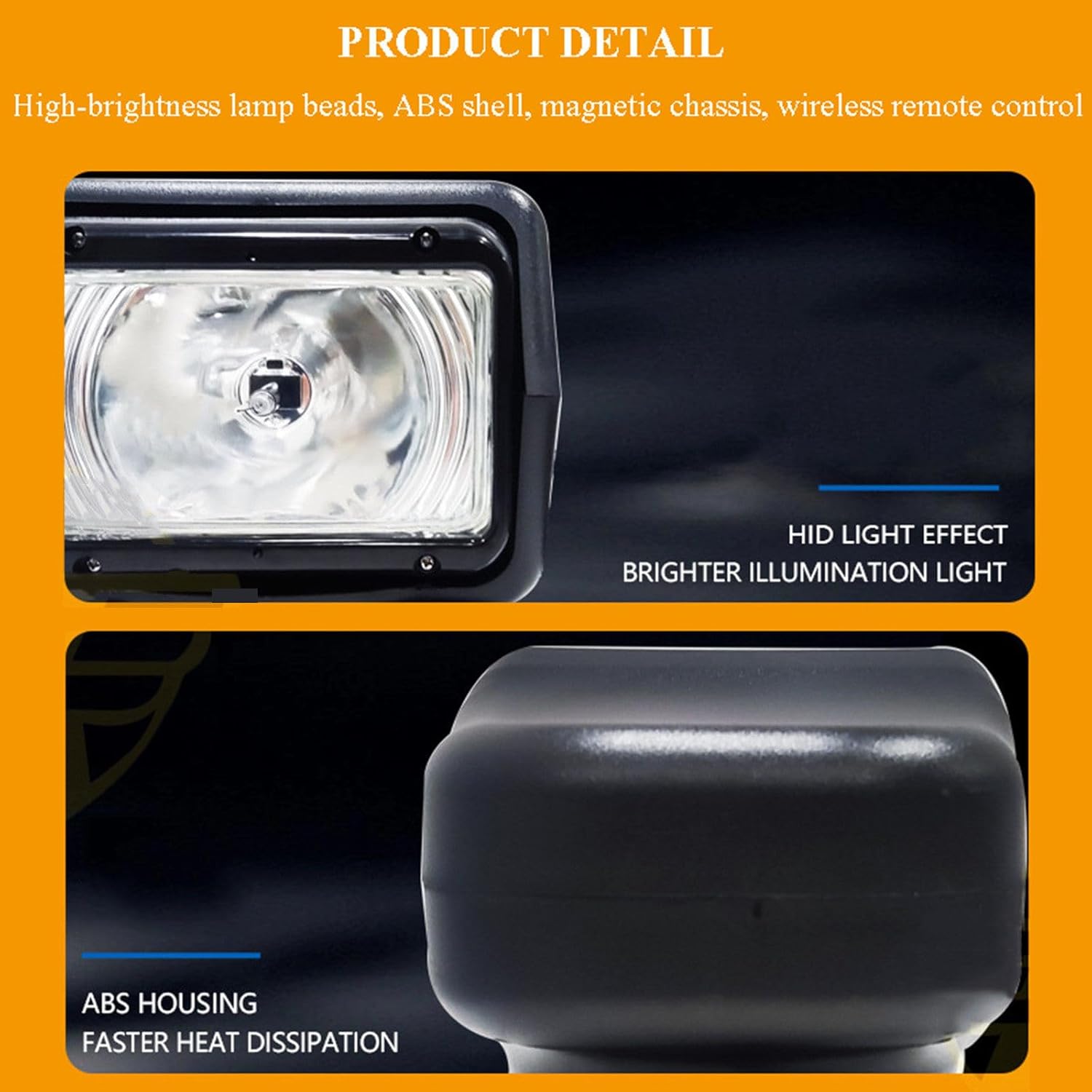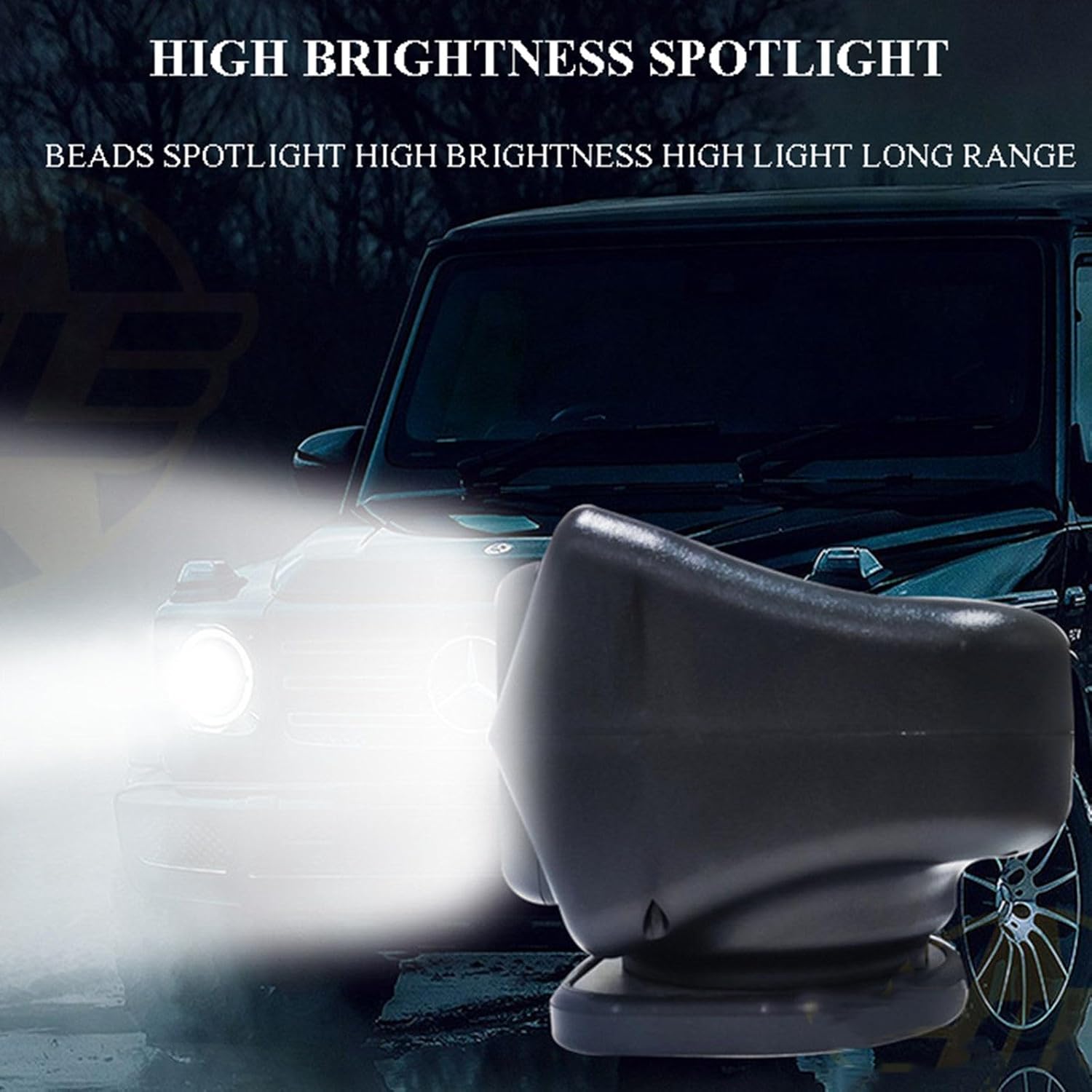 Feature:1. Wide operating voltage range: applicable to different types of vehicles2. ABS shell + aluminum alloy lamp body, faster heat dissipation, better shockproof and waterproof effect3. High-brightness concentrated light, LED lamp beads focus high-brightness and high-light long-distance shooting4. Magnetic chassis, strong magnetic suction, easy to install5. IP68 waterproof, suitable for normal illumination in severe weather such as snow and rain6. With wireless remote control, you can control it at will7. 360° left and right rotation, 120° up and down rotationSpecificationProduct name: LED searchlightProduct material: ABS+aluminum alloy+PCPower: 75WVoltage: 12 V, 24 VLuminous flux: 6500 LMProtection level: IP68Product color: blackProduct size: 145*180*170 mmApplicable: off-road vehicles, trucks, motorcycles, engineering vehicles, agricultural machinery, boatsPackage list:Vehicle searchlight*1Remote control*1Notice:Due to lighting effects and shooting angles, the product may have color differences, please understandThere are tolerances on product dimensions due to manual measurement