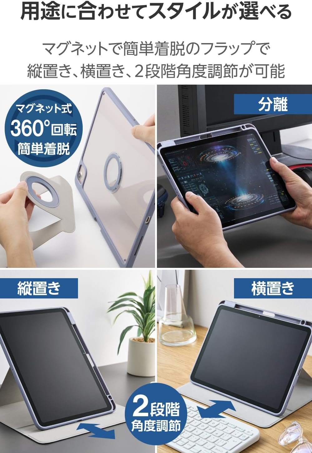 Specifications: ■Compatible models: 11-inch iPad Air (M3), 11-inch iPad Air (M2), iPad Air (5th Gen 2022 Model), iPad Air (4th Gen 2020 Model) ■ Compatible model numbers: A2591, A2589, A2588, A2325, A2324, A2316, A2072 ■Set Contents: Case x 1 ■Material: Surface: Synthetic leather; Lining: Polyester; Main body attachment: polycarbonate, TPU (thermoplastic polyurethane), magnet ■Color: Blue Gray ■Size (W x D x H): Approx. 7.7 x 0.6 x 10.0 inches (195 x 16 ■ Weight: Approximately 335g [Description] ■ Magnetic detachable flap case that rotates 360 degrees and can be used in any vertical or horizontal angle. ■ The flap part can be easily separated by magnets, making it lightweight and comfortable to use while playing games or at hand. ■ The back can be folded to use as a stand, allowing you to comfortably enjoy watching videos, etc. ■Elastic TPU (Thermoplastic Polyurethane) material on the sides and high hardness polycarbonate material on the back to protect your device from scratches. ■The back is a beautiful clear type with a sense of transparency and gloss that complements the design of your device. ■ Magnetic fixed part allows you to rotate 360 degrees, making it suitable for vertical web browsing or watching video in landscape mode. ■ Comes with a flap to protect the screen while carrying it. Close the flap and go to sleep mode when opened. ■ Flap can be easily fastened by magnet. ■ Insert the Apple Pencil into the front stylus holder for portability. ■The interior of the case uses a brushed material that prevents scratches to your devices. ■You can check the screen, charge, operate buttons and take photos with the case on. [Product inquiries] Please check on our website