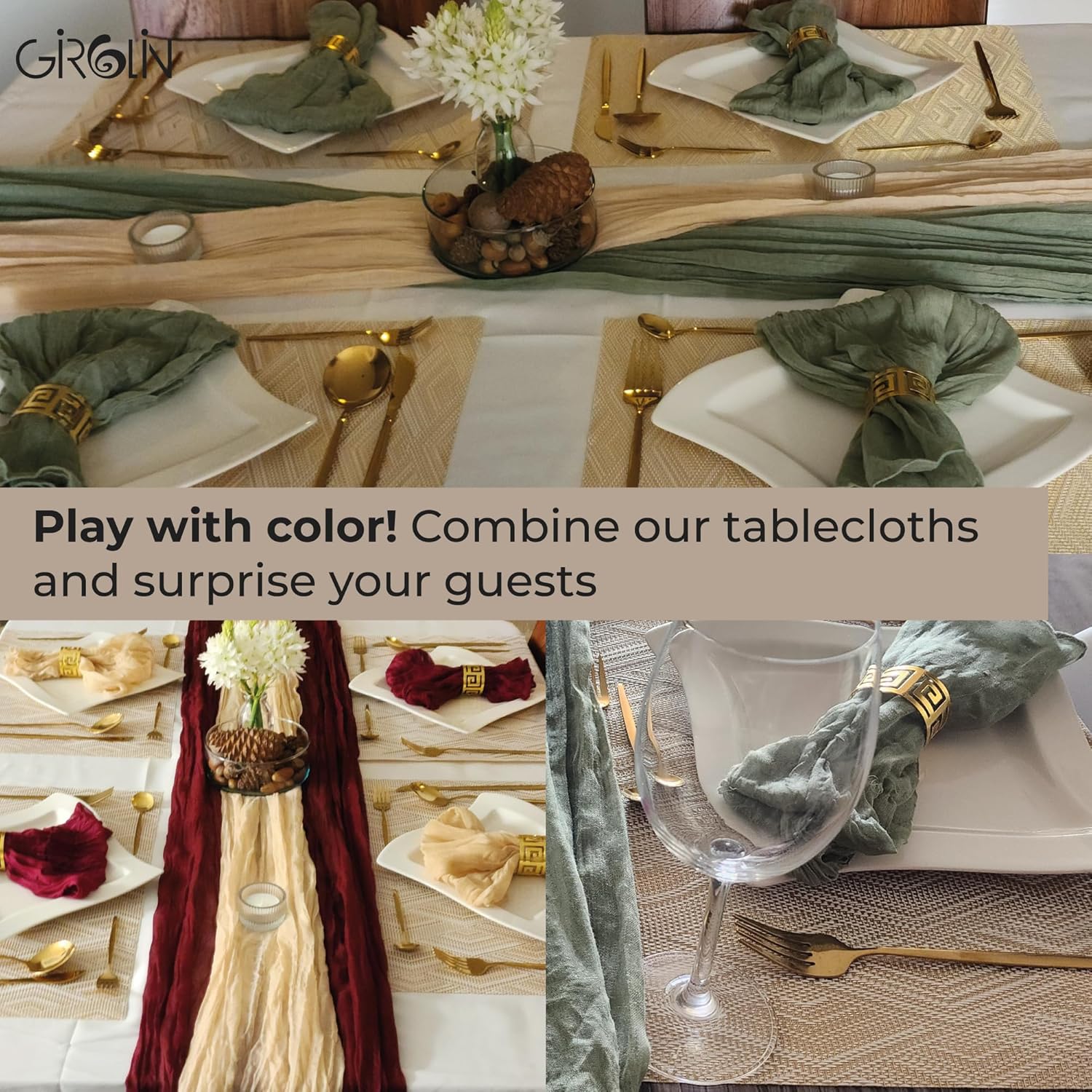 Boho Cheesecloth Table Runner: Elevate Your Tabletop Create a dreamy, boho-inspired tablescape with our versatile gauze table runner cheesecloth table runner. Perfect for weddings, parties, or everyday dining, this soft and refined runner adds a touch of rustic charm to any setting. Why Choose Our Cheesecloth Table Runner? Soft and Draped: Our cheesecloth table runners are made from high-quality, lightweight fabric that drapes beautifully and adds a touch of texture to your table. Versatile Colors: Available in sage green, burgundy, and beige, our runners effortlessly complement any decor style. From rustic farmhouse to modern minimalist, our cheesecloth table runners add a touch of elegance to any room. Easy to Style: Lightweight and flexible, making it easy to drape & arrange Perfect for Parties: Whether you're hosting a wedding, birthday party, or holiday gathering, our party table runners create a festive and inviting atmosphere. Everyday Elegance: Elevate your everyday dining experience with a touch of boho chic. Our table runners add a cozy and inviting feel to your home. Endless Possibilities Wedding Decor: Drape our cheesecloth table runners across your sweetheart table or guest tables for a romantic and bohemian wedding. Party Decor: Create a festive atmosphere for birthdays, anniversaries, & other special occasions. Home Decor: Add a touch of texture and warmth to your dining room, kitchen, or entryway. Photography Props: Use our table runners as a backdrop for your next photo shoot or as a stylish prop for flat lays. Product Details: Material: Polyester, High-quality cheesecloth Colors: Sage green, burgundy, beige Dimentions: Chesecloth Table Runner: 118 in x 35 in Napkins: 19,7 in x 19,7 in Care Instructions: Hand washing in cold water & allowing therm to air dry maturally Elevate your table setting & create a memorable experience with our boho cheesecloth table runner